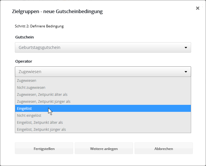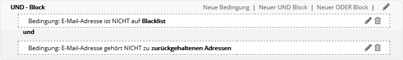 Insbesondere nach dem Kopieren einer vorhandenen Zielgruppe kann das sinnvoll sein, wenn die identischen Abonnenten in Original und Kopie nicht gewünscht sind. Bedingung anhand GutscheinFiltern Sie Abonnenten danach, ob und in welchem Zeitraum die Zuweisung oder Einlösung eines Gutscheins stattfand. Tipp: Um zugewiesene Gutscheine als eingelöst zu markieren, nutzen Sie entweder die Webservice-Funktion 'RedeemVoucherByCode' oder importieren in der Gutscheinübersicht eine CSV-Datei mit den eingelösten Gutscheincodes. Bedingung anhand SelektionMit diesem Bedingungstyp nutzen Sie eine per Webservice angelegte Selektion von Abonnenten als Glinicke-Zielgruppe. Der Bedingungstyp ist nur dann sichtbar, wenn per Webservice mindestens eine Selektion angelegt wurde. Das Besondere: In einer Selektion werden Abonnenten anhand einer Liste von IDs gruppiert. So lässt sich eine extern getroffene Abonnentenauswahl als Zielgruppe nutzen, ohne dass in den Glinicke-Abonnentendaten ein gemeinsames Merkmal vorliegen muss. Die Details entnehmen Sie bitte der Webservice-Dokumentation, die wir Ihnen gern zusenden. Bedingung anhand des Empfängers (geplant)Diese Bedingung entscheidet, ob ein Abonnent als Empfänger eines bestimmten Mailings vorgesehen war oder nicht. Das bedeutet, dass er in einer Abonnentenliste bzw. Zielgruppe für ein bestimmtes Mailing steht, welches versandt wurde. Im Unterschied zur letztgenannten Bedingung wird der tatsächliche Empfang jedoch nicht geprüft. Es sind auch alle Empfänger enthalten, die das Mailing z. B. aufgrund von Bounces, Blacklists oder serversseitigen Spamfiltern nicht empfangen haben. Bedingung anhand des Empfangens (zugestellt)Diese Bedingung entscheidet, ob jemand ein bestimmtes Mailing empfangen hat oder nicht. Das Mailing gilt als empfangen, wenn der E-Mail-Server des Abonnenten eine positive Rückmeldung erteilt hat. Im Schritt nach dem Empfang ist es dennoch möglich, dass das Mailing beim Empfänger in einem Spamordner landet. Bedingung anhand des BounceverhaltensDamit legen Sie Bedingungen anhand der Zustellungen oder Nichtzustellungen eines bestimmten Mailings an. Bedingung anhand Blacklist bzw. Zurückgehaltener AdressenAbonnenten, deren E-Mail-Adresse auf einer Blacklist oder der Liste der zurückgehaltenen Adressen steht, werden automatisch vom Versand ausgeschlossen. Dieselben* Abonnenten lassen sich per Zielgruppe filtern, etwa um sie beim Export Ihrer Abonnentendaten ebenfalls auszuschließen. Die kombinierte Zielgruppe sieht wie folgt aus:
