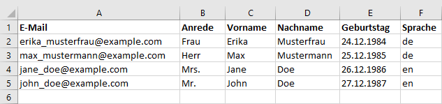 Abonnenten: ImportWahrscheinlich haben Sie bereits eine Liste von Adressen zusammengestellt, die Sie per Newsletter anschreiben möchten. Über das universelle CSV-Dateiformat lassen sich Ihre Adressen aus nahezu jeder Datenbank oder Tabellenkalkulation (z. B. Microsoft Office oder Open Office) exportieren und anschließend in Glinicke importieren. Um die Zuordnung der Spalten (z. B. Vorname, Nachname, E-Mail) beim Import zu erleichtern, sollte die erste Zeile Ihrer CSV-Datei aussagekräftige Spaltenüberschriftten enthalten. Ein Beispiel: