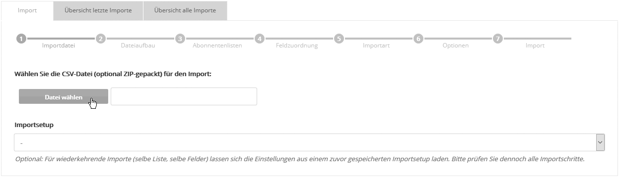 Schritt 1 - ImportdateiWählen Sie die CSV-Datei, die Sie importieren möchten. Um das Hochladen großer Dateien zu beschleunigen, können Sie die Datei vorher im ZIP-Format packen. Der Name der ZIP-Datei muss identisch zum Namen der enthaltenen CSV-Datei sein. Hinweis: Die Größe der CSV-Datei sollte 200 MB nicht überschreiten. Bitte teilen Sie größere Dateien vor dem Import auf.