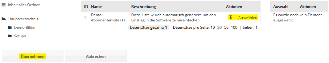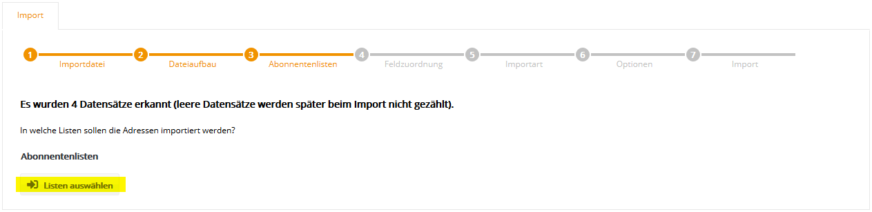 Schritt 3 - AbonnentenlistenWählen Sie nun aus, in welche Glinicke Abonnentenliste ihre CSV-Datei importiert werden soll. Falls Sie zuvor keine eigene Abonnentenliste in Glinicke angelegt haben (siehe Menü Abonnentenlisten), steht zum schnellen Einstieg die leere Abonnentenliste 'Demo-Liste' bereit. Diese Liste wird in der Regel bei der Einrichtung Ihres Glinicke Kontos angelegt und zur Demonstration mit einem Beispiel-Abonnenten befüllt.