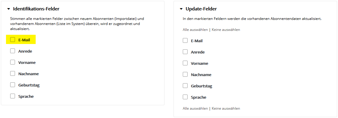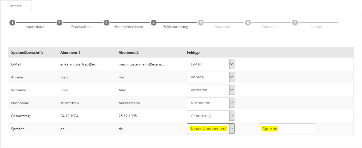 Auch die Auswahl mehrerer Abonnentenlisten ist möglich, falls Sie parallel in mehrere Listen importieren möchten. Klicken Sie nach Auswahl der gewünschten Liste(n) auf 'Übernehmen' und anschließend auf 'Weiter'. Der Name einer Abonnentenliste lässt sich im Menü Abonnentenlisten auch nachträglich jederzeit ändern. Schritt 4 - FeldzuordnungIn Schritt 4 teilen Sie Glinicke mit, welche Spalte (z.B. Vorname, Nachname) Ihrer CSV-Datei in welches Glinicke Abonnentenfeld importiert werden soll. Zum schnellen Einstieg sind typische Abonnentenfelder wie 'E-Mail', 'Anrede', 'Vorname' und 'Nachname' in Glinicke bereits vorhanden.