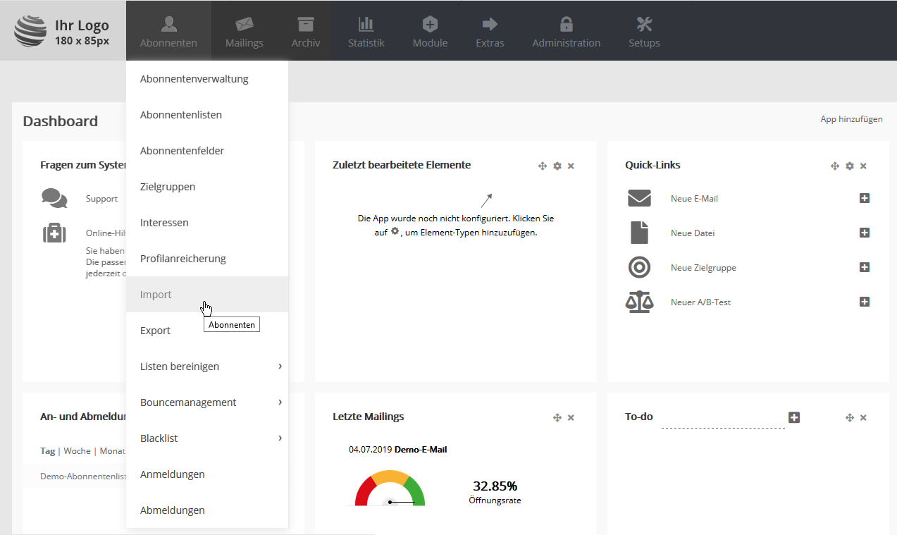 Zum Abspeichern Ihrer Daten wählen Sie bitte je nach Version Ihres Office-Paketes das Exportformat CSV UTF8 (Trennzeichen-getrennt) oder CSV (Trennzeichen-getrennt). Import Schritt für Schritt erklärtUm Ihre CSV-Datei in Glinicke zu importieren, wählen Sie im Menü 'Abonnenten' den Punkt 'Import':