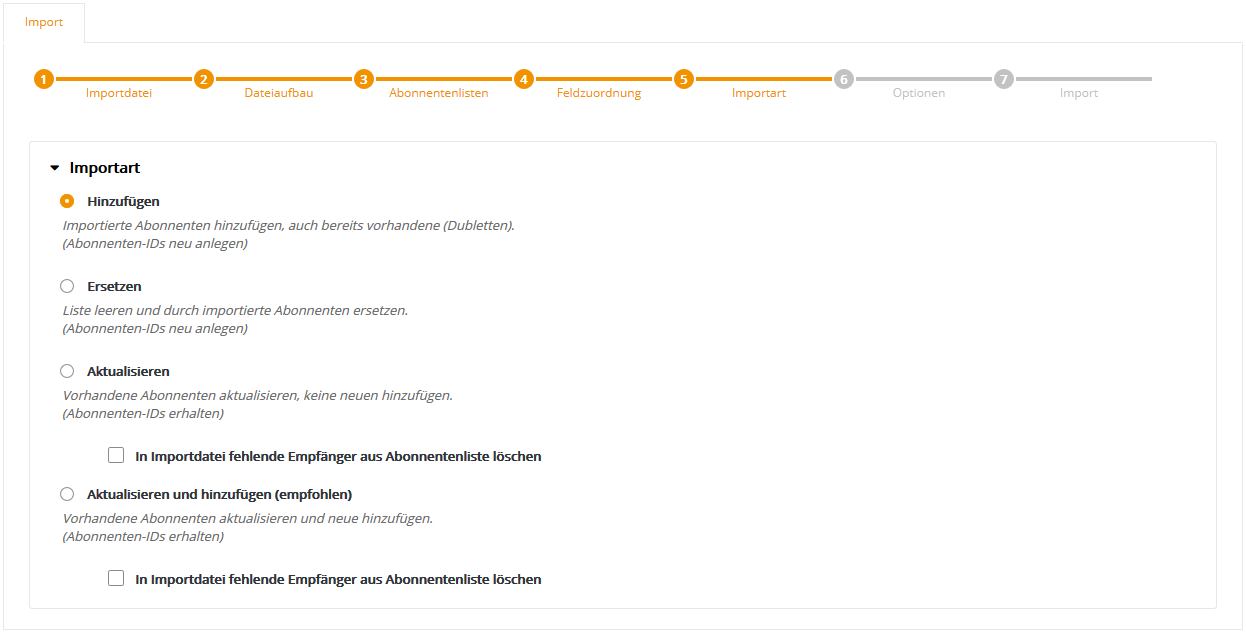 Auf der linken Seite sehen Sie am Beispiel der ersten beiden Abonnenten noch einmal den Inhalt Ihrer CSV-Datei. Auf der rechten Seite wählen Sie bitte den 'Feldtyp', der zum jeweiligen Inhalt passt. Dabei übernimmt Glinicke die Zuordnung automatisch, wenn der Name von CSV-Spaltenüberschrift und Glinicke-Abonnentenfeld übereinstimmt. Wird automatisch kein passendes Abonnentenfeld gefunden, ist der neue Feldinhalt zunächst auf 'nicht importieren' gesetzt. Wählen Sie in dem Fall entweder eines der vorhandenen Felder aus, oder nutzen Sie die Option 'neues Abonnentenfeld', um ein neues Feld anzulegen und ihm einen Namen zu geben. An dieser Stelle erhalten neue Felder grundsätzlich den Typ 'mehrzeiliger Text', siehe auch nachfolgender Tipp. Klicken Sie anschließend auf 'Weiter'. --> Tipp: Idealerweise sollten Sie sich bereits vor dem Import einmalig die Zeit nehmen, im Glinicke Menü 'Abonnentenfelder' alle Felder so anzulegen, dass Feldname und Feldtyp zu Ihren importierten Daten passen. Damit profitieren Sie zukünftig von der automatischen Feld-Zuordnung, was bei wiederkehrenden Importen nicht nur Zeit spart, sondern auch eventuelle Fehler durch unpassende Feldtypen oder die manuelle Feld-Zuordnung verhindert. Schritt 5 - ImportartHier legen Sie fest, wie Ihre neu importierten Daten mit den vorhandenen 'alten' Daten der gewählten Glinicke-Abonnentenliste(n) abgeglichen werden sollen.