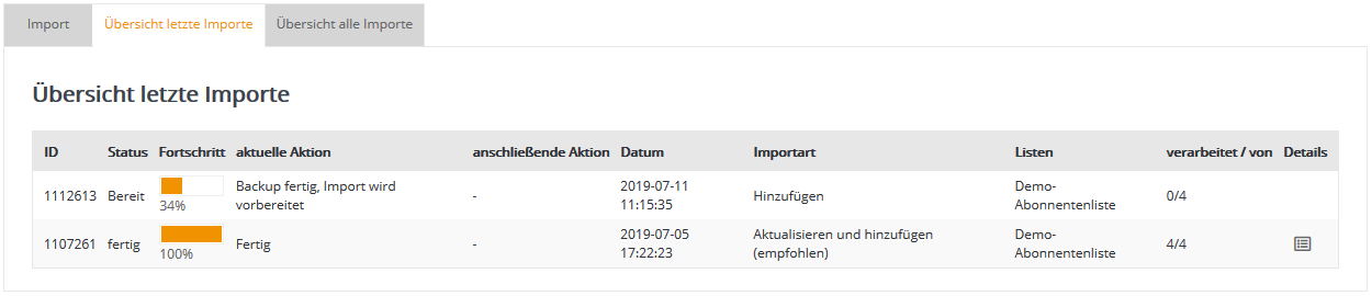 --> Importart: ErsetzenAlle Daten der ausgewählten Liste(n) werden gelöscht und durch den importierten Inhalt der CSV-Datei ersetzt. Bitte beachten Sie, dass mit den aus der Liste gelöschten Abonnenten auch deren bisheriges Nutzerverhalten (Öffnungen, Klicks, Bounces), wie z.B. 'hat letztes Mailing erhalten' und darauf aufbauende Zielgruppen-Definitionen verloren gehen. Sollte das nicht gewünscht sein, ist 'Importart: Aktualisieren und hinzufügen' die passende Alternative.