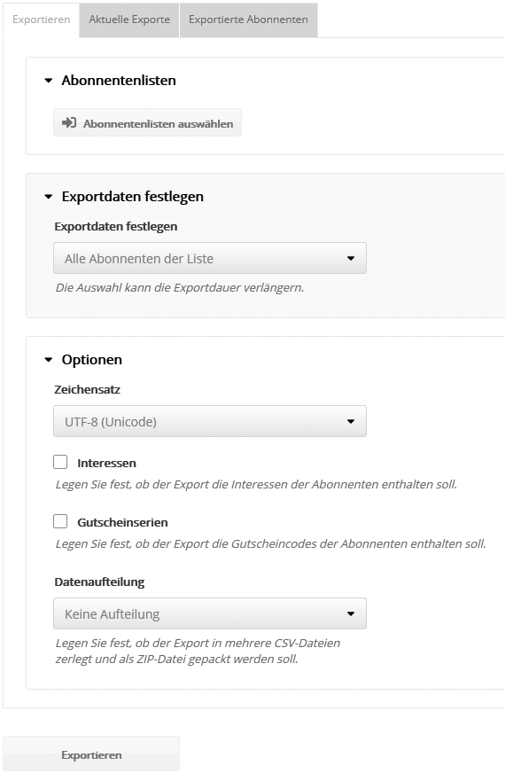 Abonnenten: ExportAbonnentenlisten lassen sich aus Glinicke als CSV-Dateien exportieren. Damit können Sie lokale Backups Ihrer Abonnentenlisten anlegen oder den Inhalt bearbeiten und anschließend per Import-Methode 'Aktualisieren' erneut importieren.