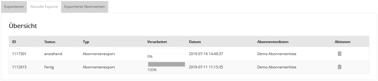 Durch Klick auf die Schaltfläche 'Exportieren' startet Glinicke den Export und wechselt zu 'Aktuelle Exporte'. Hier sehen Sie den Fortschritt des aktuellen Exports. Dem Verlaufsbalken sowie dem jeweils angezeigten Status entnehmen Sie, wann der Export erfolgreich abgeschlossen ist. Im Reiter 'Exportierte Abonnenten' finden sie die Export-Datei, die Sie nach einem Klick auf 'Download' auf Ihrem Computer speichern können.
