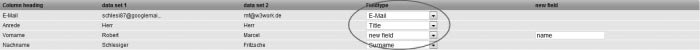 if the first line of your address file contains (as shown in the example above) the column headings, leave the item 'First line contains column headings' marked . Otherwise, if your address file starts right away with the subscriber data, unmark this option. Step 3 – Subscriber ListsChoose the subscriber list to which you want to import the addresses. Subsequently click on 'Next'. Step 4 – Field MappingNow you are asked to match the field names of your subscriber data with those of Glinicke. In order to do so, please choose in the drop down menus the associations which correspond to field information displayed to the left of these menus. If there does not exist a matching subscriber field, choose 'New Field' and enter a name for the subscriber field that needs to be created. Click 'Next'.