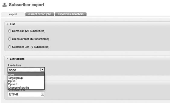 Subscribers lists can be exported from Glinicke as CSV – files. An advantage, for example, is that you can back up the address lists in this way. In the tab 'Export’, you can make choices of the lists that have to be exported. Per export only one subscriber list can be chosen. If you only want to export certain data records, you can decide on 'Limitations’. |