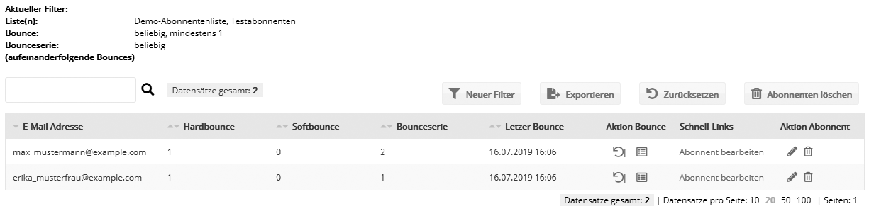 Bei Betreten der Bounce-Übersicht werden zunächst alle Bounces der aktuellen Abonnenten angezeigt.