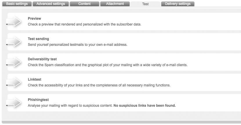 Having finished your newsletter, Glinicke offers you numerous testing possibilities. This helps you to optimize your mailing and achieve maximum success before actual dispatch. You can get to the testing functions by choosing the tab 'Test' in the menu in which you edit your mailing. Following tests are available: |