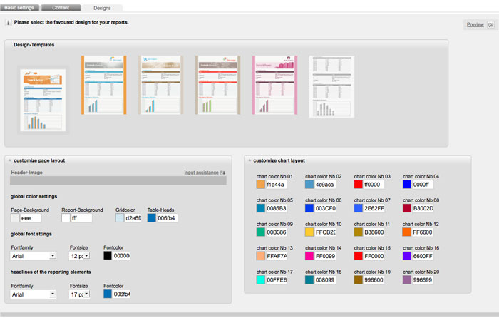 Now you also can adjust the design of your report. Choose the tab 'designs'. By default Glinicke suggests you six different layouts. HTML experts can also open the 'advanced settings' below the layouts to edit the html-code. For example you can insert your logo in th header.