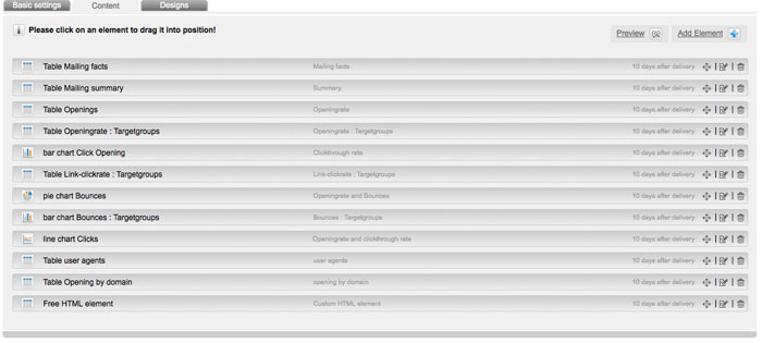Under the tab 'Basic Settings' you can edit the name and the description as well. By clicking on the tab 'Content' you now have the option to move the individual report elements using drag and drop. Also you can add or delete elements. To edit the individual elements click on the corresponding 'edit button'. Afterwards a window opens in which you can determine the name of the element, the description, the time period and the target group. When you have done all adjustments please confirm by clicking OK.
