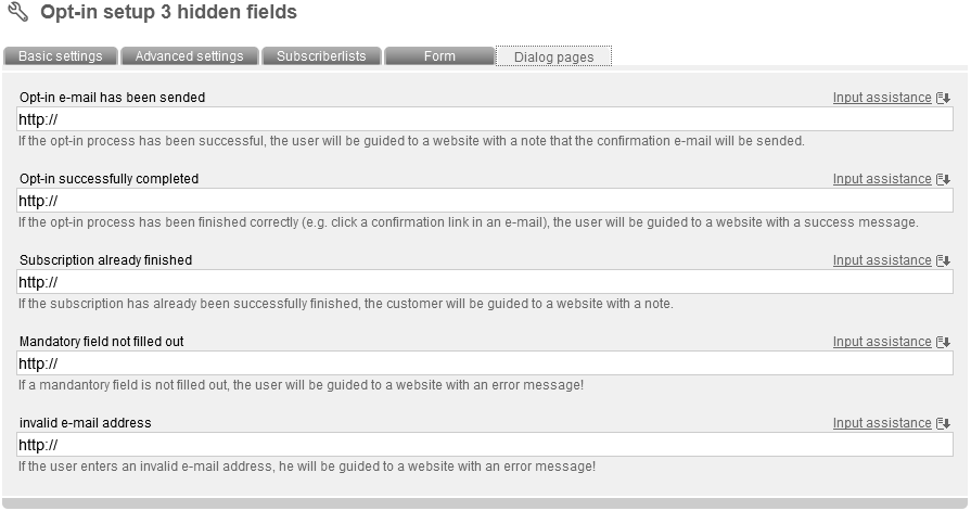 Now enter a name and an optional description for your optin setup. Then choose the 'mode' (important). The following modes are supported by 'Glinicke': Double Opt-in with confirmation e-mail (recommended as the only legally secure login variant): Interested party visits a website with an optin setup form. He enters his data into the form. He gots an e-mail with content like this: „Thank you for your optin. Please confirm the registration confirmation link to complete your registration.“ He clicks the link. Registration is completed. He gots a „welcoming“ e-mail. You can integrate information about your company and a certain design as well. Double Opt-in: Like described before, but without sending of a „welcoming“ e-mail. Confirmed Opt-In: Nach Anmeldung auf der Webseite wird sofort eine automatische Begrüßungsnachricht versendet. Single Opt-in: No e-mails will be send. There just will be a message in your browser, that registration was successfull. According to the mode you've choosed, you have to adapt different sub-options. In Tab 'advanced settings' you can deposit your e-mail address in field 'e-mail forwarding', to be informed about new subscribers. In field 'mailing for later delivery' you can determine your last sended newsletter. All new subscribers will receive your last mailing and don't have to wait for another one. To protect your optin-form against abuse, activate the invisible captcha . Captchas are often used to check if petitions are produced by a machine (robot, short: bot) or a real person. Bots are often used abusive to generate masses of subscriptions. Choose your favorite subscriberfields, which should be filled in in next tab 'Form'. After clicking 'Add subscriberfield' a pop up appears, where you can select and add subscriberfields to your optin-form. Furthermore you can add one or more subscriberlists as option(s) in a ceckbox through the button 'add subscriberlist'. Click 'sort formfields' to edit order of your fields. Click 'test form' to check your form by a preview of your optin-form. Next tab: 'Dialog pages':