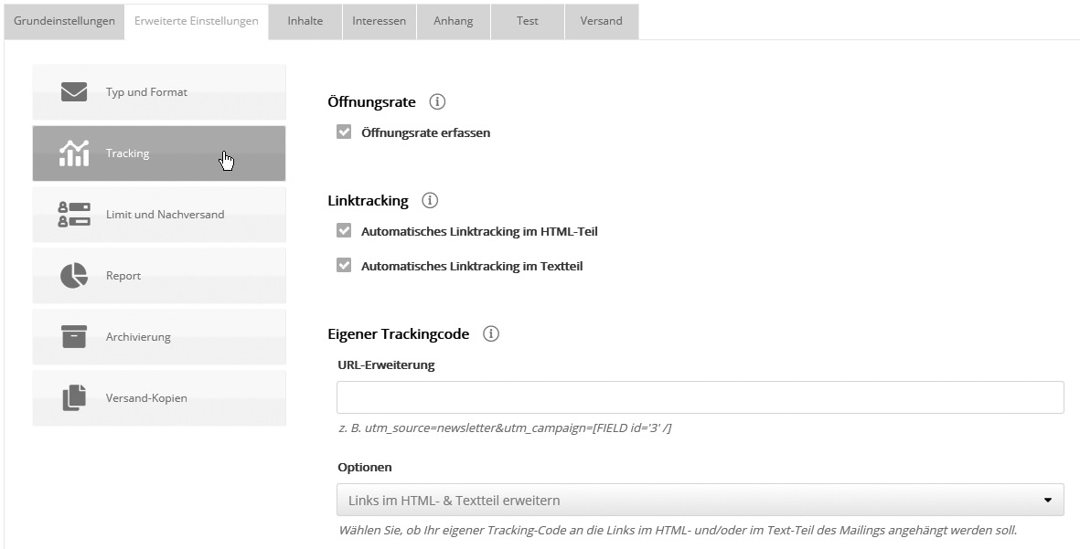 ÖffnungsrateUm nach dem Versand auszuwerten, wieviel Prozent der Empfänger das Mailing geöffnet haben (siehe 'Übersicht, Öffnungs-/Klickrate'), muss die Option 'Öffnungsrate erfassen' aktiviert sein. Dazu integriert Glinicke im HTML-Teil des Mailings ein unsichtbares Zählpixel, welches für jeden Empfänger individuell verlinkt ist und dessen Aufruf als Öffnung gezählt wird. Die Messung funktioniert unabhängig von der Mailing-Einstellung 'Inboundimages', solange der Empfänger die Anzeige von Bildern in seinem Posteingang nicht unterdrückt. Hinweis: Ist die Erfassung der Öffnungsrate deaktiviert, aber die nachfolgende Option "Linktracking" aktiviert, dann werden Klicks automatisch auch als Öffnung gewertet. Die Öffnungsrate erfasst in dem Fall nur den Teil der Öffner, der irgendeinen Link angeklickt hat. LinktrackingAktivieren Sie Automatisches Linktracking im HTML-Teil, so wird jeder im Mailing enthaltene Link durch einen Tracking-Link ersetzt, der für jeden Abonnenten individualisiert ist. Diese Tracking-Links werden über den Glinicke-Server auf die ursprüngliche Link-URL umgeleitet und dabei gezählt. Damit können Sie nach Versand des Mailings sehen, wie oft jeder Link angeklickt wurde (siehe 'Übersicht, Öffnungs-/Klickrate'). Weiterhin lassen sich darauf basierend Zielgruppen bilden, z. B. "Alle, die Link B angeklickt haben" können erneut mit weiteren Informationen angeschrieben werden. Bitte beachten Sie, dass Sie jede URL vorher als Link definieren müssen. Sie können die Richtigkeit der Tracking-Links überprüfen, indem Sie sich ein Testmailing zusenden. Eigener Tracking-CodeHier ist es möglich, alle Links des Mailings automatisch um eigene Parameter zu erweitern. Damit lässt sich das weitere Verhalten der Newsletterempfänger per Website-Analyse-Tools wie z.B. Google Analytics, Piwik oder econda tracken. Kopieren Sie dazu den Tracking Code Ihres Tools in das Feld, damit Glinicke ihn automatisch an alle externen Links Ihres Mailings anhängt. Folgende Parameter werden unterstützt: