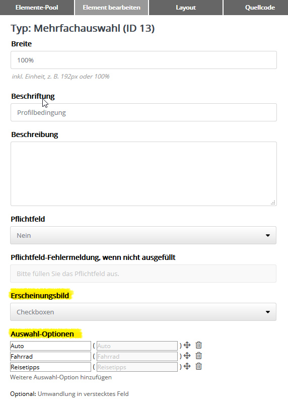Als Erscheinungsbild wählen Sie entweder 'Auswahlliste' oder 'Checkboxen' (Einfachauswahl) bzw. 'Radiobuttons' (Mehrfachauswahl).